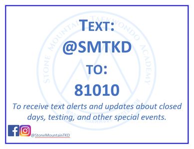 In order to subscribe to receive text alerts about belt testing, special events, and days off from school simply text "@SMTKD" to "81010" and follow the text prompts. You can also use this text messaging system to communicate directly with Master Travis. This is not a group chat so don't worry about being caught in the middle of one. This is for Master Travis to send out a bulk text message to all students or to communicate directly with individual students. You may unsubscribe at any time.